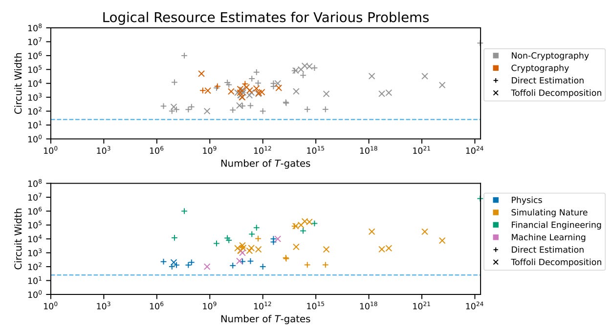 Second, when developing use cases for these future quantum computers, remember that the map is not the territory. In particular, sometimes people like to make plots of formal resource estimates which are, as the name implies, estimates on the required capabilities a quantum computer would need to have in order to solve a specific problem of a specific problem type. (An example of such a plot is given below, taken from Figure 2 of Assessing the Benefits and Risks of Quantum Computers.) And while these can be useful, there’s sometimes the temptation to then try and overlay industry roadmaps on top of those plots, to get a sense of what applications can be unlocked by when. This approach overlooks two key facts. First, advancements in quantum algorithms and fault-tolerant implementation typically reduce resource requirements, shifting them ‘down and to the left’. Second, emerging algorithms for quantum-centric supercomputers lack formal resource estimates, leaving potential ‘green space’ as yet undefined.